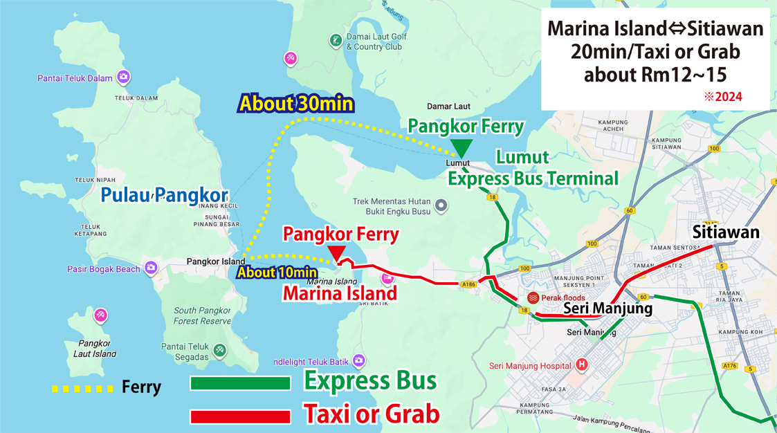 Sitiawan🚏→TAXI🚕 or Grab🚙(approx. 20 mins)→Marina Island→⛴️Ferry (approx. 15 mins)